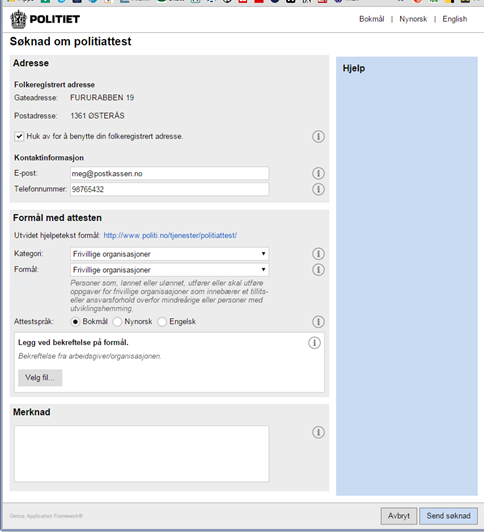 - Klikk "Send søknad" (nederst) og vent på svar (i posten) fra politiet. Dette kan ta opptil fire uker så søk i god tid før du trenger attesten.